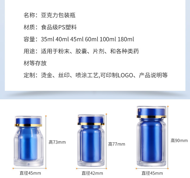 滄州明潔生產(chǎn)銷售保健品分裝瓶,粉末瓶,藍色內(nèi)膽亞克力瓶,海參瓶,中藥粉瓶,10ml保健品瓶,便攜式小藥瓶,藥片瓶,膠囊瓶,藥丸瓶,35ml亞克力瓶,軟膠囊瓶,亞克力瓶,壓片糖果瓶,60ml內(nèi)膽瓶,保健品塑料瓶,中藥丸瓶,避光塑料瓶,ps保健品瓶,固體片劑瓶,塑料藥瓶,產(chǎn)品規(guī)格_,外觀新穎,彰顯大氣。